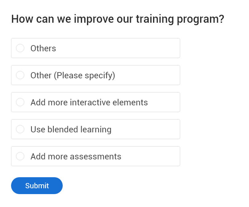 Since a course will have several topics and sub-topics, you can ask this question to determine which part of the course your learners have liked the most.